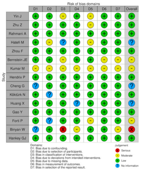 The risk of bias in the included studies was assessed according to Cochrane Bias Methods Group guidelines and risk of bias assessment figures were generated using the risk of bias visualization tool (Robvis) [13,14]. The revised tool for risk of bias in randomized trials (RoB2) was used for randomized trials (RCT); the revised tool for risk of bias in non-randomized study of intervention (ROBINS-I) was used to assess potential bias in non-randomized studies (NRS) (Figure 4 and Figure 5).