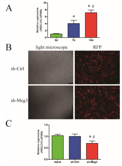 Expression of MEG3 during BMSCs osteogenic differentiation and MEG3 knockdown BMSCs. (A) Bar graphs show the expression levels of MEG3 in BMSCs at days 0, 7 and 14 of osteogenic differentiation. (B) BMSCs after lentiviral transfection were observed under an optical microscope and a fluorescence microscope. (C) The expression of MEG3 was determined by qPCR in lentivirus blank group, sh-Ctrl group and sh-Meg3 group (n = 3/group). * p < 0.05 versus the blank group. # p < 0.05 versus sh-Ctrl group.