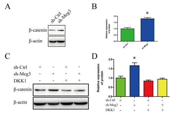 Wnt/β-catenin signaling pathway plays an important role in the osteogenic differentiation of BMSCs. To gain insights into the mechanism by which MEG3 regulates osteogenic differentiation of BMSCs, the expression changes of β-catenin in BMSCs were performed. Western blot results showed that the protein level of β-catenin increased in the sh-Meg3 group when compared with sh-Ctrl group (p < 0.05, Figure 3A,B). DKK1 was previously reported as an inhibitor of Wnt/β-catenin pathway.