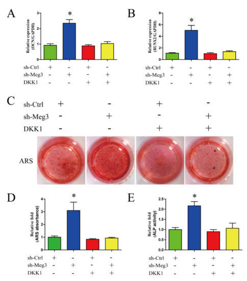 Moreover, there was also less matrix mineralization at day 28 of osteogenic differentiation in the sh-Meg3 group treated with DKK1than in sh-Meg3 group (Figure 4C,D). Blocking the Wnt/β-catenin pathway was able to reverse the osteogenesis activity induced by knockdown of MEG3 as indicated by ALP activity (p < 0.05, Figure 4E). These results indicate that the Wnt/β-catenin pathway could mediate the osteogenesis effect of MEG3.
