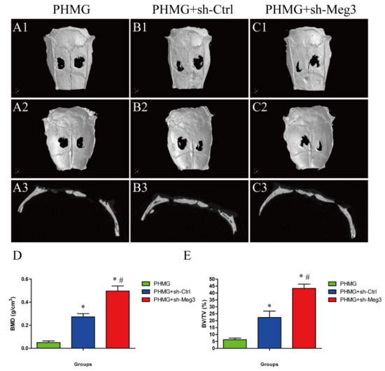 MEG3 knockdown in BMSCs promoted bone repairing in vivo. (A1–C3) Representative micro-CT images show the bone repairing in PHMG, PHMG + sh-Ctrl and PHMG +sh-Meg3 groups at 8 weeks. Bar graph shows quantitative analysis of micro-CT vessel volume in each group. Morphometric analysis of BMD (D) and BV/TV (E) as determined by micro-CT for each group at 8 weeks. * p < 0.05 versus the PHMG group, # p < 0.05 versus PHMG + sh-Ctrl group. (n = 6/group).