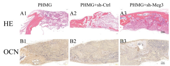 HE staining clearly showed that barely any new bone formation was found in the PHMG group (Figure 6(A1)). Only a small amount of new bone formation was observed in the PHMG + sh-Ctrl group (Figure 6(A2)). Whereas in the PHMG + sh-Meg3 group, the ingrowth of new bone formation was evident in the central area of the defects as well as in the peripheral area near the pre-existing bones (Figure 6(A3)). The osteogenic marker OCN was also detected by IHC staining of decalcified craniums of each group. The results showed that there was less positive staining for OCN in the PHMG group (Figure 6(B1)). Positive brown staining for OCN was more apparent in the PHMG + sh-Ctrl (Figure 6(B2)) and PHMG + sh-Meg3 groups (Figure 6(B3)). HE and OCN IHC staining analysis of bone regeneration in calvarial defects indicated that Meg3 knockdown in BMSCs can increase bone regeneration.