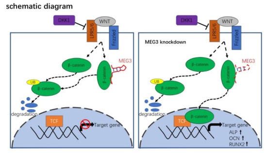 Wnt/β-catenin signaling is a crucial pathway in the skeleton controlling osteoblast differentiation and bone formation [18]. With wnt/β-catenin pathway acting, wnt ligands bind to Frizzled and low-density lipoprotein receptor-related protein 5/6 (LRP5/6) receptors and induce stabilization of cytoplasmic β-catenin by inhibiting glycogen synthase knase 3 beta (GSK3β). β-catenin migrates into nuclei and forms a complex with transcriptional factor Tcf/Lef that transactivates target genes of the Wnt signaling pathway [19,20]. Previous studies have shown that disruption of β-catenin affects the osteogenic differentiation of BMSCs [21,22,23] and leads to extensive bone marrow adiposity and low bone mass [24]. Interestingly, crosstalk between MEG3 and Wnt/β-catenin pathways affected tumorigenesis [25,26], osteogenic differentiation [13,27] and bone formation [17], suggesting MEG3 is a regulator of Wnt signaling.