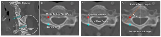 Sagittal and axial computed tomography images of the cervical spine illustrating the morphometric measurements and medial pedicle pivot point (MPPP). (A) The facet–pedicle distance was measured from the tip of the inferior articular process of the cephalad vertebra, to a point intersecting a line drawn through the center of the pedicle in the sagittal view (light blue line). (B) The red circle indicates the MPPP located at the correct point/center of the pedicle. The light blue circle indicates the starting point. (C) Pedicle diameter was measured as shown. The lateral mass depth was measured from the starting point at the dorsal border of the lateral mass, to the MPPP. (D) The pedicle insertion angle corresponded with the vertical angle of screw application, while the pedicle total length corresponded with the approximate maximum length of the screw that could be inserted into the pedicle.