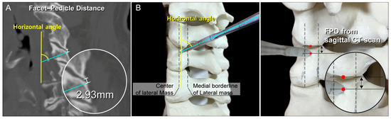(A) Cervical spine of a vertebral model showing the starting point and corresponding computed tomography image (sagittal view) (B) The starting point was located between the center, and medial third of the lateral mass, at a specific distance from the tip of the inferior articular process of the cephalad vertebra. The facet-pedicle distance was estimated using the diameter of the burr tip (3 mm) used to drill the initial hole in the lateral mass. The horizontal angle represents the angle between the pedicle axis, and long axis of the body or floor axis. FPD, facet–pedicle distance.