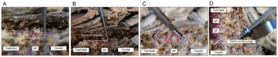 Cadaver images showing the surgical technique. For the technical expression of pedicle screw placement using MPPP, when it is implemented on actual patients, there are concerns about the limitation of visualization of anatomical landmarks due to surgical site contamination or bleeding. Therefore, technical expression was implemented for cadaver for pedicle screw placement using MPPP. (A) The pedicle probe was vertically inserted up to a depth corresponding with the lateral mass distance of the specific pedicle. (B) The pedicle probe was then inserted to a depth 2 mm less than the pedicle total length, directed at an angle corresponding with the appropriate horizontal and pedicle insertion angles (PIAs). (C) A tap was used to expedite screw insertion and lessen the torque required to insert the screw. A ball-tipped probe was used to confirm the integrity of the pedicle borders after tapping. (D) A 3.5 mm pedicle screw of appropriate length was inserted following the same horizontal angle and PIA. SP, spinous process.