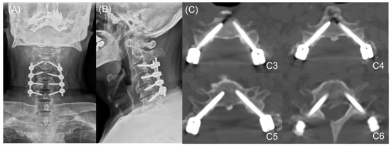 Cervical spine radiographs and computed tomography (CT) of screw insertion (A) Cervical spine anteroposterior radiography, (B) Cervical spine lateral radiography, and (C) Cervical spine axial images of CT scan.
