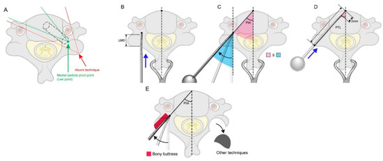 In this study, we report our results using a newly described technique for pedicle screw fixation involving the MPPP. The position of the MPPP was medial, as it was located ventromedially from the commonly described starting point for pedicle screw insertion [17,22,23]. Using the lateral mass bone and medial pedicle wall as a buttress around the MPPP, the angle of the pedicle probe’s tip changes from a vertical direction to one that corresponds with the transverse PIA and horizontal angle for a given pedicle (Figure 5).
