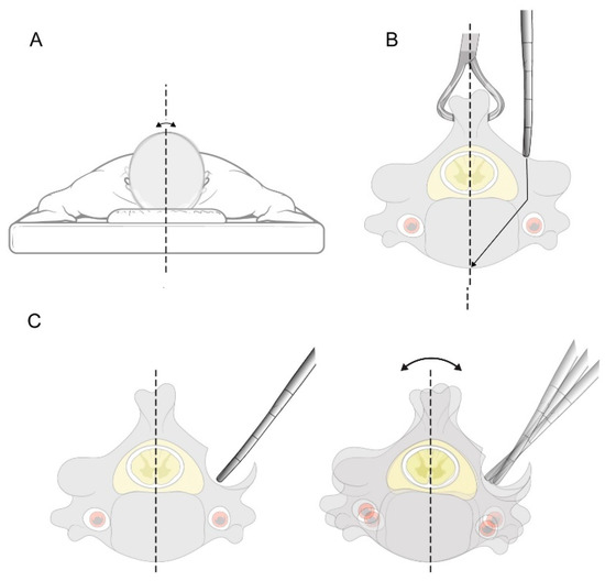 Schematic diagram demonstrating the difference between techniques. (A) Position of the patient during the procedure. The head of the patient could be rotated during screw fixation, even when positioned on a Mayfield frame. (B) The use of a towel clip to prevent rotation of the vertebra during gearstick probing. (C) Use of other techniques may result in a greater likelihood of misplacing the gearstick due to unquantified removal of lateral mass, as well as rotation of the vertebra.