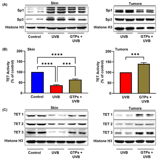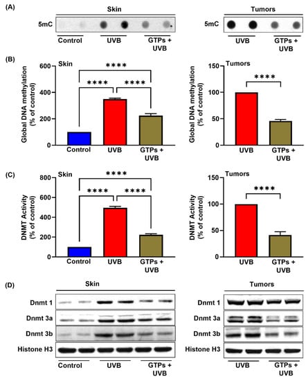 DNA hypermethylation is one of the fundamental epigenetic mechanisms that control gene expression and contributes to pathogenesis by silencing the tumor suppressors. Therefore, to determine the effect of GTPs on UVB-induced DNA hypermethylation, we measured DNA methylation levels using dot blot analysis, ELISA, and Western blots. As seen in Figure 1A,B, the expression of 5mC and the levels of global DNA methylation were higher in UVB-exposed skin (3.5-fold; p < 0.0001) compared with non-UVB exposed skin (control). Oral administration of GTPs in drinking water reduced UVB-mediated DNA hypermethylation in the skin (225.2 ± 14.41 vs. 349.0 ± 7.43; p < 0.0001) and in tumors (up to 50%; p < 0.0001). However, the levels of DNA hypermethylation were higher in GTPs-treated skin compared with the control group.