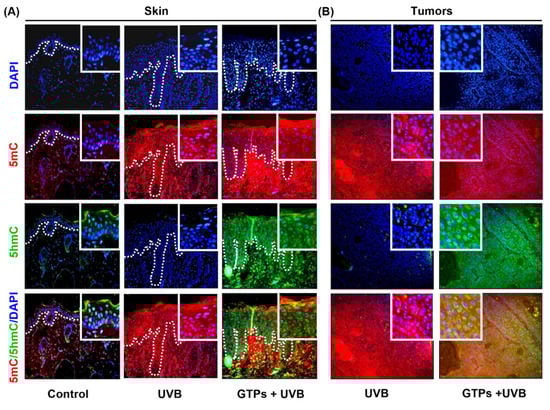 Effect of GTPs on the expression levels of 5mC and 5hmC in UVB-exposed skin and tumors of SKH-1 hairless mice. To define the occurrence of the UVB-induced tumor, the epidermis is demarcated by the dotted white line. The expression of 5mC (red), 5hmC (green), and colocalization (yellow) in the skin (A) and tumors (B) (n = 6).