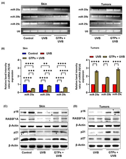 Tumor suppressor genes synthesize proteins that control cell proliferation and regulate tumor growth. It has been suggested that epigenetic silencing of tumor suppressor genes p16, p21, p27, and RASSF1A is also associated with DNA hypermethylation [,,,] and contributes to cancer progression. Therefore, we determine the effect of GTPs on p16, p21, p27, and RASSF1A protein expression in skin (Figure 4C) and tumors (Figure 4D). Protein expression of p16, RASSF1A, p21, and p27 was decreased in both UVB-exposed skin and tumor samples as determined by the Western blot analysis. As a result, when exposed to GTPs, the expression levels of p16, RASSF1A, p21, p27 remained higher.