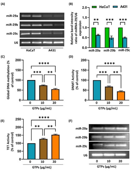 Expression of miR-29 in A431 and the effect of GTPs on epigenetic modulators and miR-29 family members in skin cancer cells. MiR-29 expression in A431 and HaCaT cells (A,B). Skin cancer cells (A431) were treated with GTPs in dose-dependent manner (0, 10, 20 µg/mL) for 5 days. After 5 days of GTPs treatment, the levels of global DNA methylation (C), DNMT activity (D), and TET activity (E) were measured in all groups. Effect of GTPs on miR-29a, 29b, and 29c (F). U6 was used as a loading control. Data are presented as a percentage of the control (non-GTPs-treated) group, which was assigned a value of 100%, and as means ± S.E.M, n = 3. ** p < 0.002, *** p < 0.0009, **** p < 0.0001.