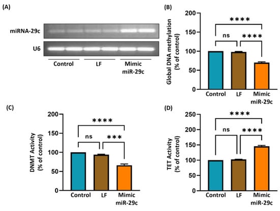 Effect of mimic of miR-29c on epigenetic modulators in skin cancer cells. Skin cancer cells (A431) were transfected with mimic miR-29c (100 nM) in lipofectamine medium for 72 h. (A) After 72 h of transfection, miRs were isolated by the Trizol-chloroform extraction method, and cDNA was subjected to RT-PCR using specific primers for miR-29c. U6 was used as a loading control. The levels of global DNA methylation (B), DNMT activity (C), and TET activity (D) were measured in all groups. Data are presented as a percentage of the control (non-transfected) group, which was assigned a value of 100%, and as means ± S.E.M, n = 3. LF; Lipofectamine. *** p < 0.0002, **** p < 0.0001. ns = not significant.