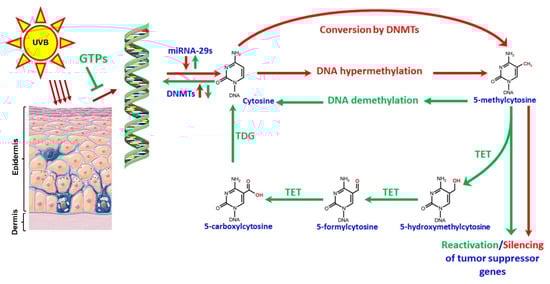 An illustration of the mechanism GTPs adopt to prevent photocarcinogenesis via targeting miR-29s-mediated DNA hypermethylation. Exposure to UVB radiation diminishes the expression levels of miR-29s and leads to activation of DNMTs and promotes DNA hypermethylation, resulting in the silencing of tumor suppressor genes and contributing to tumor growth. GTPs treatment blocks the UVB-induced damage and restores the expression of miR-29s to stop DNA hypermethylation through inhibition of DNMTs. As a parallel mechanism, GTPs treatment activates TET enzymes and converts existing 5mC into 5-hmC followed by 5fC and 5caC to promote DNA demethylation, which leads to growth inhibition by reactivation of silenced tumor suppressors. Red arrows indicate the UVB radiation-regulated pathway while green arrows show the GTPs-regulated pathway. DNMT, DNA methyltransferases; TET, ten-eleven-translocation; TDG, thymine DNA glycosylase. Parts of the figure were obtained from Servier Medical Arts, freely available at https://smart.servier.com.