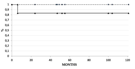 In 10 out of 12 eyes, complete success was achieved during the study period, while two eyes had a qualified success, one (case 4) requiring two glaucoma medications (brinzolamide and travoprost), and one (case 9) a single drug (tafluprost). No cases of failure occurred during the time encompassed by this study (alpha = 0.05, CI 93.98–100%). Kaplan–Meier curves for complete and qualified success are shown in