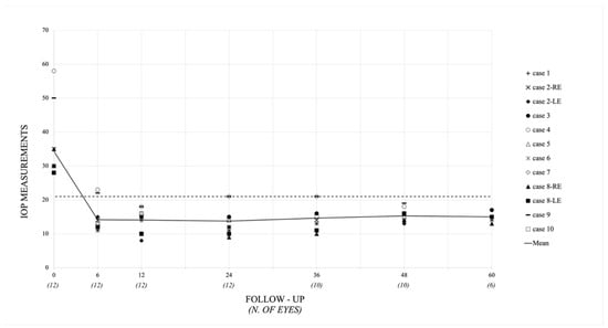 A complete 360° trabeculotomy was achieved in all eyes. In three cases, a second scleral incision in the infero-temporal quadrant was required to locate the SC, and in two cases, catheter reinsertion and viscoelastic injection were required to complete canalization. Immediately after surgery, a moderate hyphema was observed in all patients that spontaneously resolved within two weeks. In three cases, transient shallowing of the anterior chamber was noted one week after surgery, while other postoperative complications were not encountered.