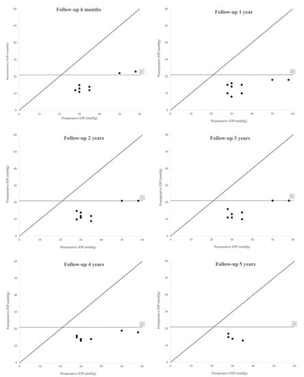 Mean postoperative IOP was 14.2 ± 4.1 mmHg at six months, 14.8 ± 3.2 mmHg at one year, 13.7 ± 3.9 mmHg at two years, 14.64 ± 3.7 mmHg at three years, 15.3 ± 1.9 mmHg at four years, and 15.0 ± 2.4 mmHg at five years, while mean IOP of the fellow eyes was 13.5 ± 4.4 mmHg, 15.2 ± 3.0 mmHg, 14.0 ± 4.2 mmHg, 15.7 ± 2.6 mmHg, 15.0 ± 2.4 mmHg, and 14.0 ± 0.0 mmHg, at the same time points (