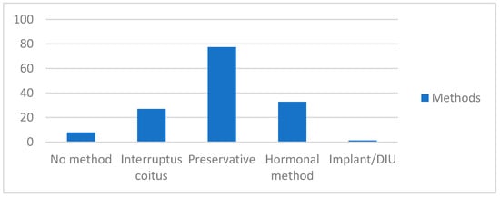 Participants were asked for the contraceptive methods used throughout their sex life. The most common contraceptive method is the condom (77.4% (370)), followed by hormonal methods (pill, patch, and ring) (32.8% (157)). A high percentage of young people still use coitus interruptus as a method to avoid pregnancy (27% (129)), and almost 7.9% (38) do not use any method during their sexual relations as shown in Figure 1.