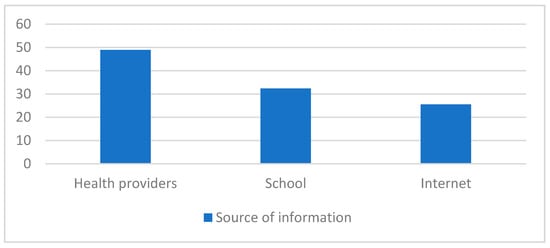 In total, 7 out of 10 students declared they had been provided with some type of information on contraception methods, including the emergency contraceptive pill. The major information sources of those who acknowledged having received previous training were via health professionals (48.96% (165)), the Internet (32.34% (109)), and at school (25.51% (86)), as shown in Figure 2.