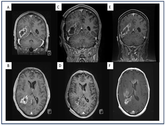 Exemplary representation of a multifocal, midline-crossing GBM under therapeutic AC on the first recurrence after standard-of-care treatment. Preoperative coronal (A) and axial (B) gadolinium-enhanced, T1-weighted MRI of a GBM patient and a right parieto-occipital contrast-enhancing lesion. Postoperative coronal (C) and axial (D) gadolinium-enhanced, T1-weighted MRI of the same patient after GTR where no contrast enhancement is present. Coronal (E) and axial (F) gadolinium-enhanced, T1-weighted MRI of the same patient with therapeutic AC upon first progression with multifocal, midline-crossing GBM recurrence in the right hemisphere.