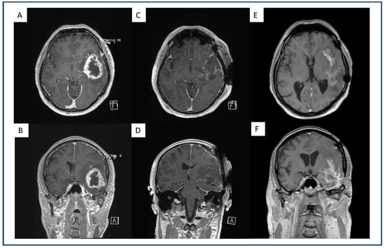 Exemplary representation of a dull demarcated GBM under therapeutic AC, on the first recurrence after standard-of-care treatment. Preoperative axial (A) and coronal (B) gadolinium-enhanced, T1-weighted MRI of a GBM patient with a left fronto-temporal contrast-enhancing lesion. Postoperative axial (C) and coronal (D) gadolinium-enhanced, T1-weighted MRI of the same patient after GTR where no contrast enhancement is present. Axial (E) and coronal (F) gadolinium-enhanced, T1-weighted MRI of the same patient with therapeutic AC upon first progression with a dull demarcated recurrent lesion.