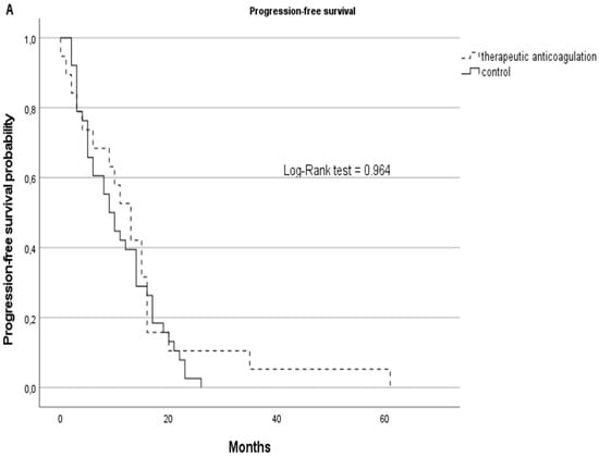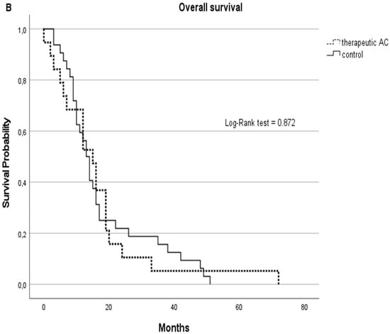 Although statistically non-significant, the therapeutic AC cohort showed better survival rates with a median of 13 months in PFS (SD: 14) vs. 9.5 (SD:7) months in the non-AC group and a median OS of 15 months (SD: 15) vs. 12.5 (SD: 13) months in the non-AC group. Kaplan–Meier curves are displayed in Figure 3.