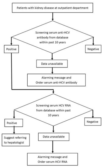 There are many impediments to the HCV screening/treatment cascade, and the first barrier is the diagnosis of HCV [8]. An efficient method of improving HCV screening is essential to eliminate HCV. Automatic computerized alerts are the optimal method in clinical practice [9]. Electronic reminder systems have shown promising outcomes in Japan and the United States [10,11]. Alert systems have been used for populations with a high prevalence (i.e., baby boomers or those with HIV/HCV coinfection) in the United States, and the screening rates have increased. Limited data are available in relation to the use of an electronic reminder system for HCV screening in patients with kidney disease. We designed and assessed an electronic reminder system for HCV screening in patients with kidney disease in the outpatient departments of a medical center.
