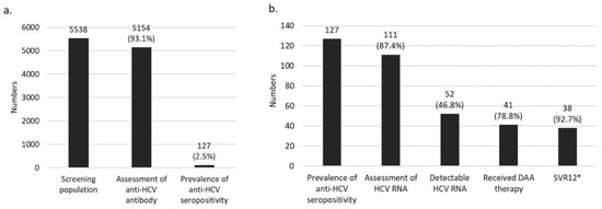 HCV care cascade. (a) Number and rate of anti-HCV antibody assessments. (b) Number and rate of HCV RNA detection, treatment and SVR12. * ITT-SVR was 92.7% and PP-SVR was 100%. The SVR data were unavailable in three patients until May 2021.