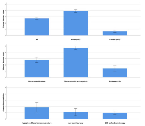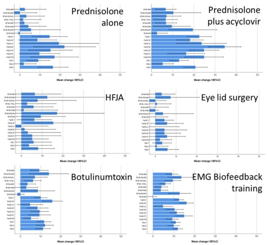 The interval between first and last presentation for all patients was 1.1 ± 1.9 years (acute palsy: 0.9 ± 1.9; chronic palsy: 1.4 ± 1.9 years). The outcome measures for the first and last visit for the different treatments are shown for the Stennert index and the FDI in Table 6 and for the FaCE and the SF-36 in Table 7. The absolute improvement of facial grading for selected subgroups is presented in Figure 1. Overall, facial grading improved highly significantly (p < 0.001) for patients with acute or chronic palsy during the treatment in the center. The changes of the PROMs are presented in Figure 2. Treatment with glucocorticoids, acyclovir, and antibiotics was followed by a highly significant improvement of all outcome measures (p < 0.001). The effect was less notable for the SF-36 (p < 0.05). In case of chronic flaccid palsy, hypoglossal–facial-nerve jump suture, any eyelid surgery, and especially an upper eyelid weight led to significant improvement of facial motor function (p < 0.001) and facial-specific quality of life (FDI, FaCE; p < 0.05), but not to an improvement in the general quality of life (SF-36; p > 0.05). Conservative measures, such as physical therapy, botulinum toxin injections, special facial exercises at home, or facial EMG feedback training, also led to highly significant improvements according to facial grading, FDI, and FaCE (mostly, p < 0.001). Again, the effect was not highly significant for the SF-36. There was one exception, general quality of life was significantly improved when using botulinum toxin injections for facial synkinesis (p < 0.001). In addition, Table S5 regards the improvement from the perspective of acute and chronic facial palsy separately and for the PROM subdomains. Treatment of patients with acute palsy improved in nearly all subdomains highly significantly (p < 0.001), for general quality of life significantly (SF-36; p < 0.05). Patients with chronic facial palsy showed highly significant improvements (mostly p < 0.001), except for some SF-36 subdomains (p > 0.05). Glucocorticoids alone for acute facial palsy were effective in regard to the improvement of facial grading, FDI, and FaCE, but not for the SF-36 subdomains (Table S6). Botulinum toxin injections for facial synkinesis were also effective, seen in the improvement of facial grading and of FDI and in some subdomains of FaCE and SF-36 (mostly p < 0.001). The improvement for patients with facial synkinesis was even greater after EMG facial biofeedback training (mostly p < 0.001; Table S7). The improvement was less pronounced for surgical procedures, analyzed for the larger subgroups of hypoglossal–facial jump surgery and eyelid surgery: Facial grading was significantly improved, along with some FDI subdomains and a few FaCE subdomains, and only the SF-36 physical functioning subdomain after hypoglossal–facial jump surgery.