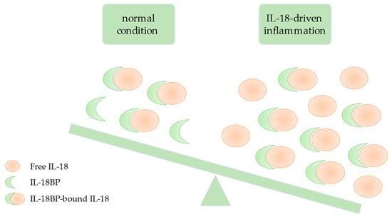 IL-18 has been considered to play a pathological role in many diseases, according to the data derived from various animal models [24,25,26,27,28]. Furthermore, high circulating levels of IL-18 have been measured in a large number of inflammatory diseases [21,29,30,31,32,33,34], and IL-18 has been shown to be overexpressed in affected organs, such as the intestinal mucosa in Crohn’s disease, the synovial tissue in rheumatoid arthritis, and the skin lesions in psoriasis [35,36,37]. Nonetheless, two clinical trials using recombinant IL-18BP (tadekinig alfa) failed to demonstrate any efficacy of IL-18 blockade in rheumatoid arthritis and psoriasis [38]. Indeed, it appears that, more than the total IL-18 levels, the amounts of free, IL-18BP-unbound, bioactive IL-18 are critical to consider when trying to decipher the role of IL-18 in the pathophysiology of one disease.