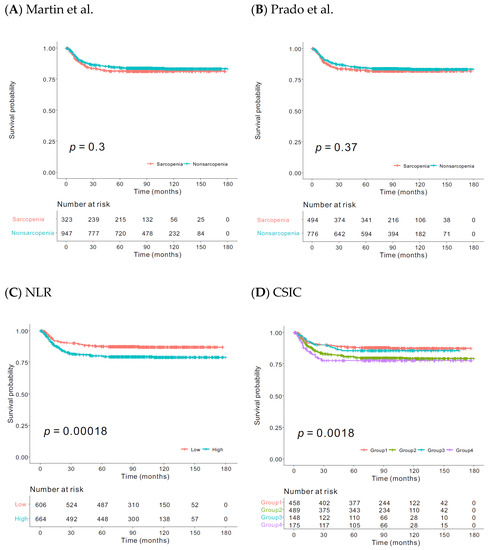 Figure 1. Kaplan–Meier curves of progression-free survival (PFS) in the groups, based on sarcopenia according to (A) the criteria by Martin et al., (B) criteria by Prado et al., (C) neutrophil-to-lymphocyte ratio (NLR), and (D) combined sarcopenia and inflammation classification (CSIC).