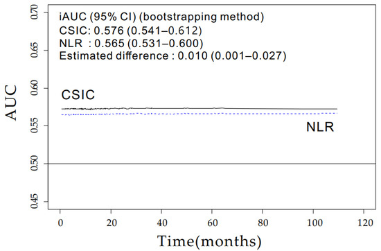 Figure 2. Time-dependent area under the curve (AUC) plot for comparing the prognostic accuracy of the combined sarcopenia and inflammation classification (CSIC; solid line) and neutrophil-to-lymphocyte ratio (NLR; dashed line). Bootstrap iAUC mean values of CSIC and NLR are 0.576 (95% CI, 0.541–0.612) and 0.565 (95% CI, 0.531–0.600), respectively. The increased integrated AUC (iAUC) of CSIC when compared with NLR represents the superior prognostic accuracy of CSIC (bootstrap iAUC mean difference = 0.010; 95% CI, 0.001–0.027).