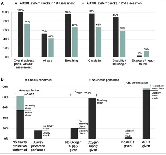 While oxygen and ASD (not being an integral part of the ABCDE approach) were administered independently of breathing checks and neurological examinations, airways were protected significantly more often by participants performing complete airway examination (p 0.035; Figure 2B).