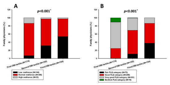Resilience categories according to BRS scale (A) and healthy lifestyle categories according to FLQ scale (B) in OBI total score tertiles in study population; BRS—Brief Resilience Scale; FLQ—Fantastic Lifestyle Questionnaire; OBI—Oldenburg Burnout Inventory; * chi-square test.