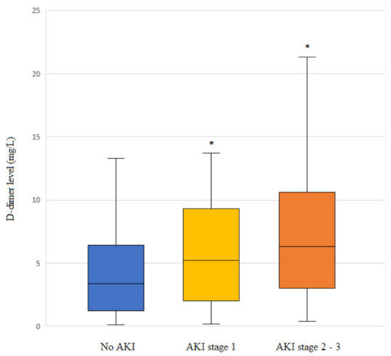 D-dimer levels according to acute kidney injury (AKI) stage in patients undergoing living-donor liver transplantation (LDLT). Box plots show the median (line in the middle of the box), interquartile range (box), and 5th and 95th percentiles (whiskers). * p < 0.001 vs. no AKI.