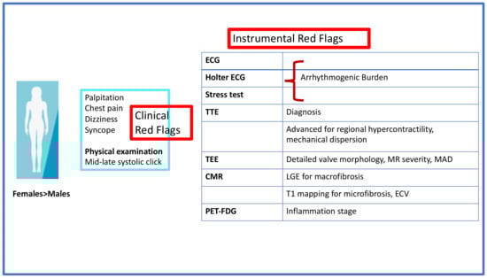Clinical and instrumental red flags. CMR, cardiac magnetic resonance; ECG, electrocardiography; ECV, extracellular volume; FDG, fluorodeoxyglucose; LGE, late gadolinium enhancement; MAD, mitral annular disjunction; MR, mitral regurgitation; PET, positron emission tomography; TEE, transesophageal echocardiography; TTE, transthoracic echocardiography.