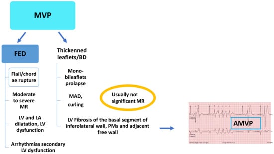 Mitral valve prolapse (MVP): fibroelastic deficiency (FED), Barlow’s disease (BD). AMVP, arrhythmic mitral valve prolapse; LA, left atrium; LV, left ventricle; MAD, mitral annulus disjunction; MR, mitral regurgitation; PM, papillary muscle.