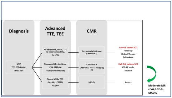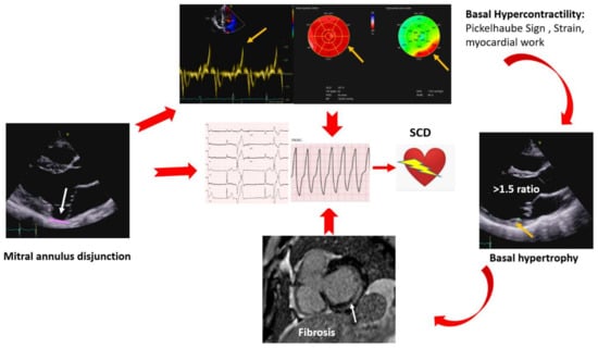 The renewed interest in MVP derives from anatomo-pathological findings [,,,] and, more recently, multimodality imaging studies [,,,,,] that identified myocardial lesions responsible for c-VA and eventually SCD. In fact, the so-called malignant “arrhythmic MVP “(AMVP) seems to have a specific phenotype including thickened bileaflets, fibrosis of papillary muscles and inferobasal wall, and mitral annulus disjunction (MAD), a structural abnormality manifesting as a wide separation between the left atrial wall–mitral valve junction and the left ventricular (LV) attachment in the setting of no significant MR []. As elegantly described by Reinier and Chugh in their editorial [] commenting Dilling’s et al. paper [], postmortem diagnosis alone might underestimate the prevalence of malignant MVP whereas cardiac magnetic resonance (CMR) can have the potential to identify those MVP patients at high risk. This is particularly important because, beyond the classical definition of MVP, the challenge is to identify the subset of patients at risk of developing c-VA and SCD using multimodality imaging and to guide the best treatment (Figure 1).