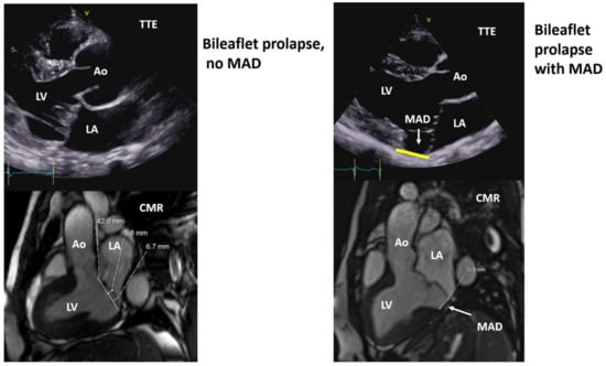 The first-line imaging modality for the diagnosis of MVP is transthoracic echocardiography (TTE), which allows assessment of the structural characteristics of the valve, i.e., leaflet thickness, uni- or bileaflet prolapse, prolapse size, presence and severity of MR, left atrial and LV dimension and function []. Additional focused measurements/parameters need to be evaluated in order to improve the identification of patients at high risk for arrhythmias or SCD []. MAD can be seen on TTE in the parasternal long-axis view as well as in the 4- and 2-chamber view [], along with curling with a good correlation between TTE and CMR, particularly for MAD >2 mm [,,] (Figure 4).