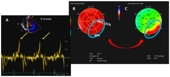 Moreover, curling is suggested to be related to progressive myxomatous degeneration of the mitral leaflets []. Prolapse, MAD, and curling are linked to hypercontractility of the basal segments of the inferior, posterior, and anterolateral wall. Myocardial stretch by the prolapsing leaflets results in higher tissue velocity that abruptly affects the papillary muscles and adjacent myocardium; this sharp traction may ultimately be, per se, a trigger of PVCs and c-VA. In addition, long-term hypermobility and stretch could evolve into local fibrosis. Higher tissue velocity can be measured by tissue Doppler imaging from the standard apical window, with the probe aligned according to mitral annulus motion. A Doppler systolic velocity ≥16 cm/s (Pickelhaube sign) is considered a marker of AMVP [,]. Hypercontractility is also responsible for the hypertrophy of the basal segments behind the PML []. Data derived from CMR in MVP patients showed a basal to mid segment ratio >1.5, which was found to be higher in patients with positive LGE, although without reaching statistical significance []. Advanced TTE methods can be used for regional hypercontractility such as segmental longitudinal strain [] of the mid-basal segments of the posterior and anterolateral walls, and for the detection of increased mechanical work [,]. Myocardial work is a parameter that combines longitudinal deformation and afterload, and MVP patients with regional increase in longitudinal strain also have increased mechanical work. The underlying rationale is that repeated local myocardial traction increases energy demand and oxidative stress with local hypertrophy and fibrosis [] (Figure 5).