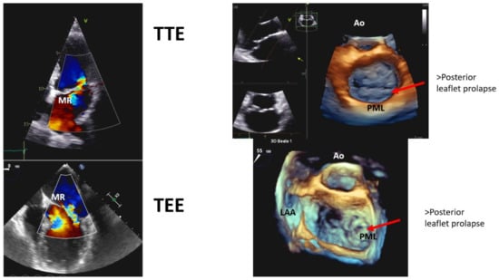 Comparison between transthoracic (TTE) and transesophageal echocardiography (TEE) in the assessment of mitral valve structure and mitral regurgitation (MR). Ao, aorta; LAA, left atrial appendage; PML, posterior mitral leaflet.