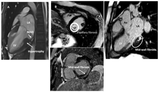 MAD is an anatomical entity that has been associated with MVP; it is an abnormal insertion of the hinge line of the posterior mitral leaflet (PML) on the atrial wall, characterized by distinct separation of the mitral valve annulus-left atrial wall and the basal region of the posterolateral LV myocardium, also defined as atrialization of the posterior leaflet base. MAD can involve either a large or small portion of the mitral annulus, usually the mid and central portion. In early reports, this entity was also described in normal hearts, though as a rare finding [] or as a normal variant []. More recently, the group from the University of Padua, Italy showed that MAD and systolic curling of the PML were associated with LV fibrosis of the inferobasal wall and papillary muscles in both SCD victims with MVP and MVP patients with c-VA, likely due to the excessive mobility of the mitral valve apparatus and systolic stretch of the myocardium closely linked to the valve [,]. Actually, a pathological cut-off for MAD is not available for any of the different methods used for its detection. In 67 patients undergoing surgical correction of MAD, Eriksson et al. [] found a mean value of annular disjunction of 10 mm at transesophageal echocardiography (TEE) in severe MVP versus 8.2 mm in a control group with mild to moderate mitral valve degeneration. Dejgaard et al. [] recorded a mean value of MAD of ≥1 mm on CMR and 6 mm on TTE, and Perazzolo et al. [] reported a mean value of MAD of 4.8 mm on CMR. Carmo et al. [] suggested a TTE cut-off of MAD of 8.5 mm with a good sensitivity and specificity for the prediction of non-sustained ventricular tachycardia (VT). It seems therefore that MAD is not an exclusive feature of MVP, but the length of MAD correlates with the severity of prolapse, myocardial fibrosis, and VA.