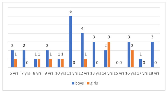 97 participants took part in the project—40 children (31 boys and 9 girls) aged 6–18 years (M = 12, SD = 3.43) (the number of respondents in each age group is shown in Figure 1) and their parents (57 individuals: 35 mothers and 22 fathers).