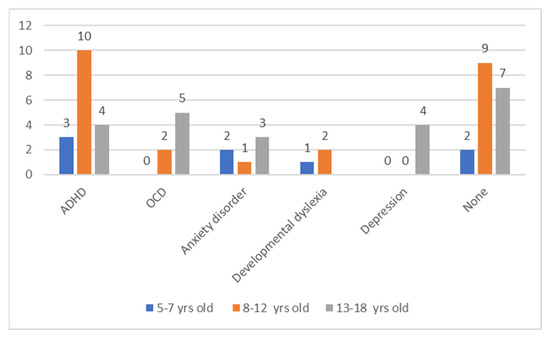 An interview was conducted, during which the subjects declared the number and type of co-morbidities. Several children reported the occurrence of more than one condition. The frequency of the coexistence of individual disorders is presented in the figure below (Figure 2).