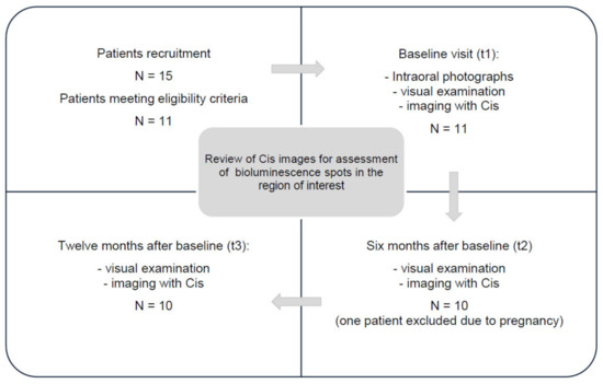 In the present in vivo study, we calculated the sensitivity and specificity to compare the results with other studies. Typically, a gold standard, such as histological findings, is needed. Due to the clinical nature of our study, and because no teeth were scheduled for extraction, we could only calculate sensitivity and specificity based on the visual findings. In a previous in vitro study with histology as the gold standard, the bioluminescence system showed a good result in the diagnostic accuracy, comparable to the visual assessment of active vs. inactive lesions []. The findings of laboratory-based studies were used as a basis for the preparation of the present monitoring study. Here, the findings were not only based on each single visit. Moreover, the clustered nature of the data was considered by a statistical model. Even when using such a multilevel model, no difference between the visual and Cis findings was observed.