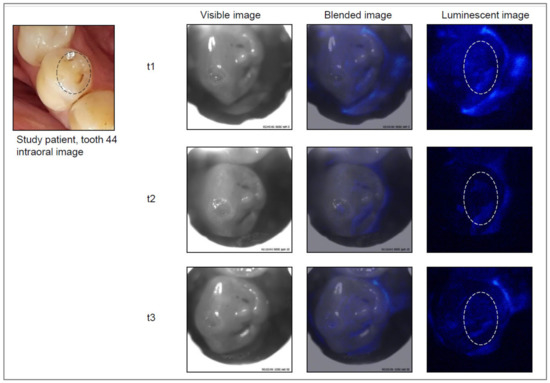 Example of a study tooth (upper right molar) with an active lesion at all visits. The bioluminescence signal was lower at t2 and t3 but still visible.