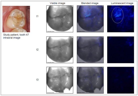 Example of a study tooth (lower right premolar) with an inactive lesion. At t1, a bioluminescence signal was visible all over the occlusal surface, whereas at t2 and t3, no signal was detectable in the fissure.