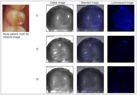 There are reports of using optical devices for the detection and quantification of noncavitated early enamel lesions [] as a tool for the documentation and monitoring of lesions. Such methods can support the diagnostic process in quantifying and/or visualizing caries. A new approach aims to distinguish between active and inactive lesions based on bioluminescence measurements. The Calcivis® Imaging System (Calcivis Ltd., Edinburgh, UK) is a novel method based on the bioluminescence technique for detecting demineralization in enamel. The bioluminescence technique consists of applying a specific calcium-sensitive photoprotein to the tooth surface. The photosensitive protein binds to free calcium ions, which are released during the demineralization of enamel [,], and a light signal is emitted upon binding to solvated calcium ions. If the tooth is undergoing net demineralization, a light signal can be observed []. Such luminescence areas are typically present as blue spots, demonstrating the presence of demineralized surfaces. In a preliminary study on occlusal caries lesions, the bioluminescence system demonstrated high reproducibility and good diagnostic accuracy values for the assessment of active caries lesions in vitro based on histological findings []. Moreover, the ability of the bioluminescence technology to identify demineralization on smooth surfaces adjacent to orthodontic brackets was shown []. In a recently published paper, the bioluminescence system could differentiate tooth surfaces clinically identified as involving active enamel lesions from sound sites [].