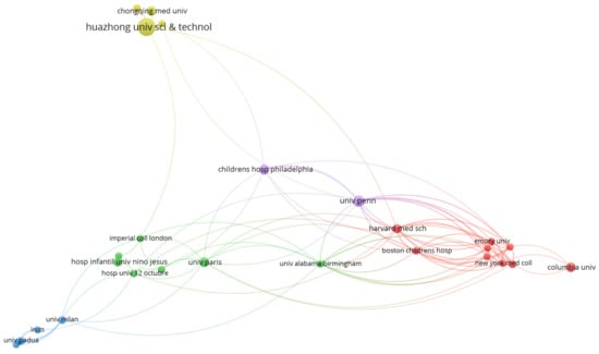 Relevant organizations in this field of study, in terms of production and citation, were from China—Huazhong University of Science and Technology from Wuhan, Whan University, Chongqing Medical University; the USA—Children’s Hospital of Philadelphia, University of Pennsylvania, Columbia University; France—Université de Paris, Necker-Enfants Malades University Hospital; Spain—Hospital Infantil Universitario Niño Jesús; Turkey—University of Health Science; and Italy—University of Milan.